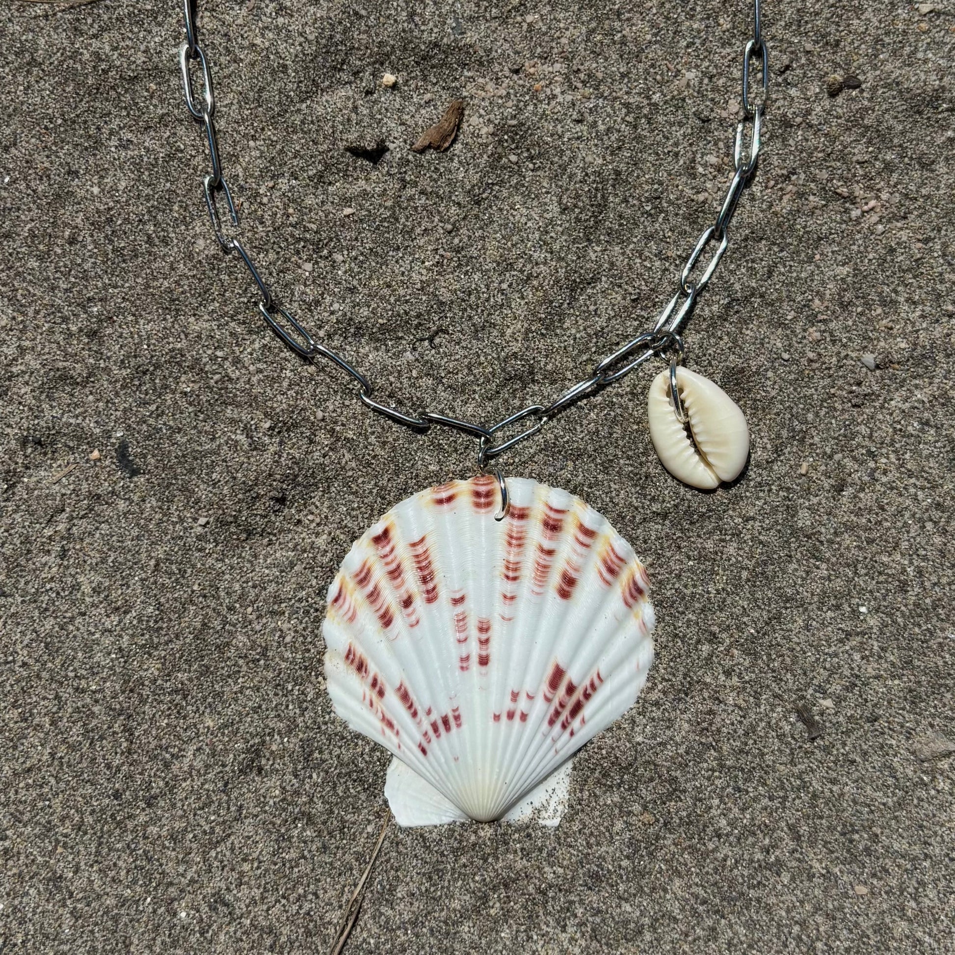 Un collier en acier inoxydable inspiré du souffle des vents marins, combinant un Pecten maximus aux teintes blanches et rouges avec un cauri naturel. Ce bijou aérien et élégant capture l’essence des rivages, évoquant les légendes et les vents légers qui caressent les flots.