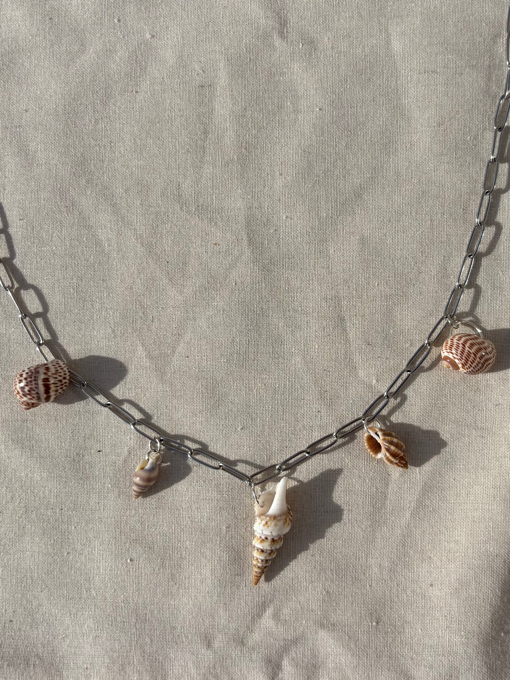 Le collier Isla capture la magie du rivage quand la mer se retire, révélant ses plus beaux trésors. Suspendus à une chaîne argentée à maillons larges, cinq coquillages véritables, tous différents, racontent chacun une histoire venue des vagues.