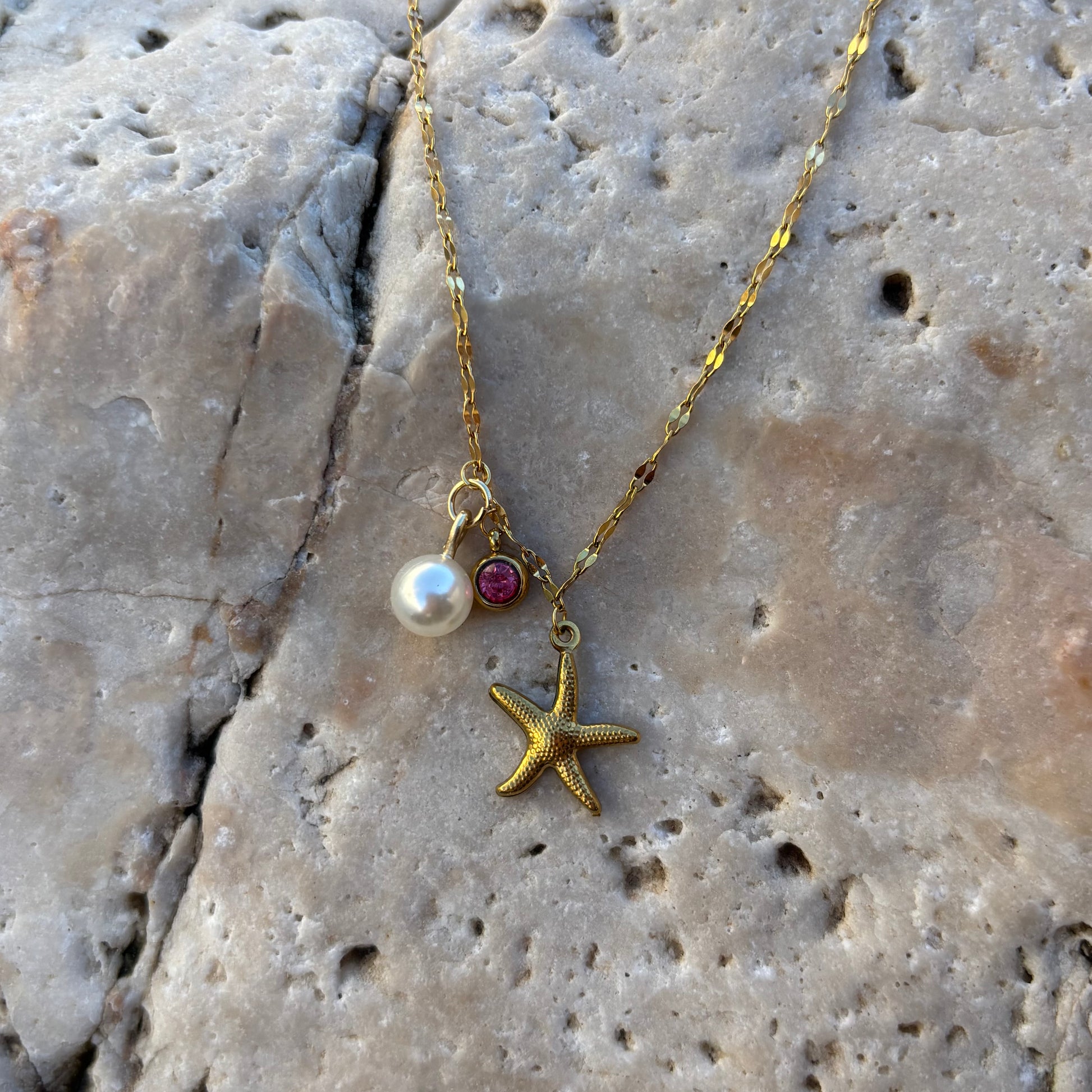 Le collier Nérée mêle l’éclat doré d’une étoile de mer à la douceur d’une pierre rose et à la pureté d’une pierre blanche. Un bijou élégant et lumineux qui évoque les reflets du soleil sur les vagues.