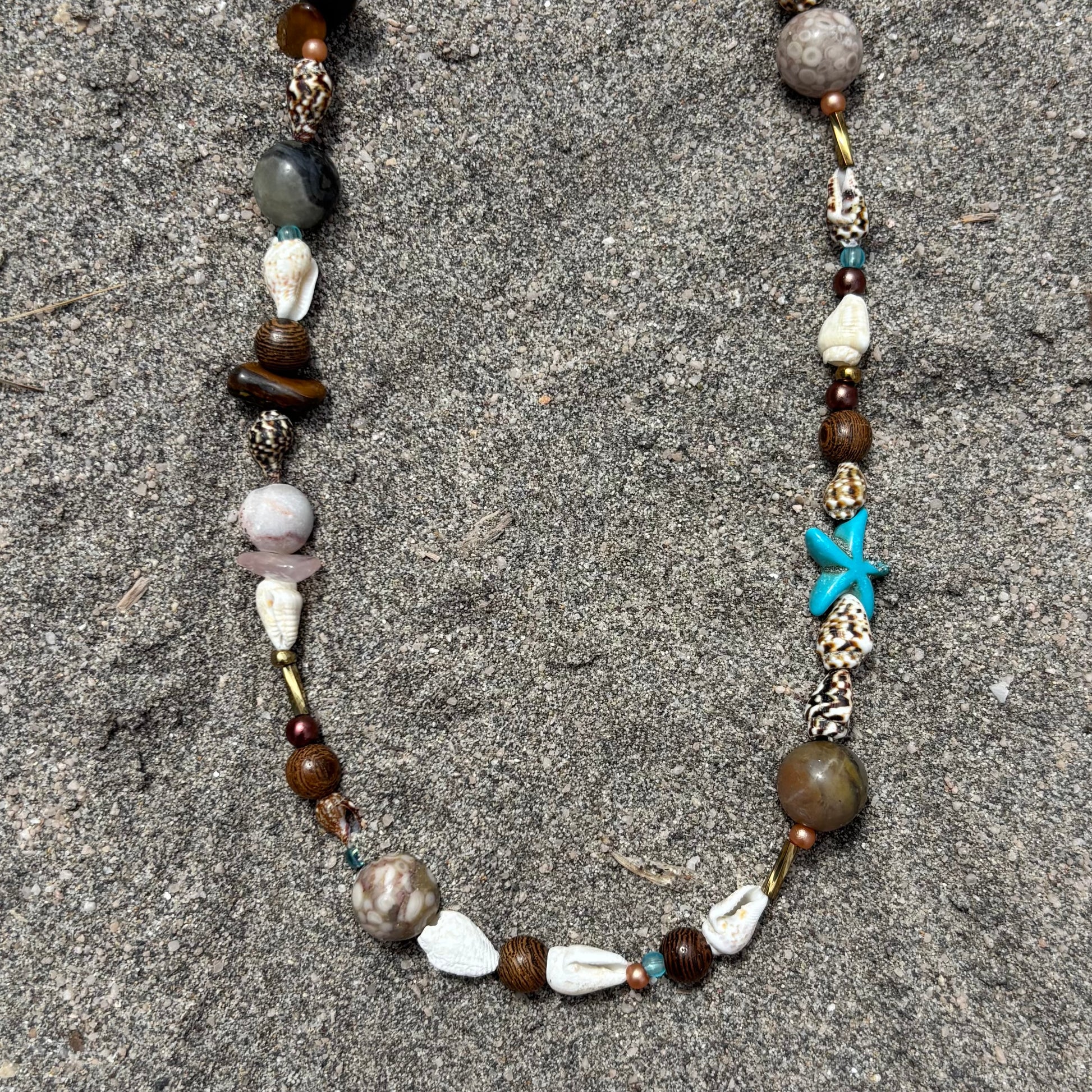 Océana est un collier riche en matières, en reliefs et en histoire. Il mêle perles naturelles, coquillages polis par les vagues, bois, pierre, et une étoile de mer turquoise qui semble sortir d’un lagon lointain.