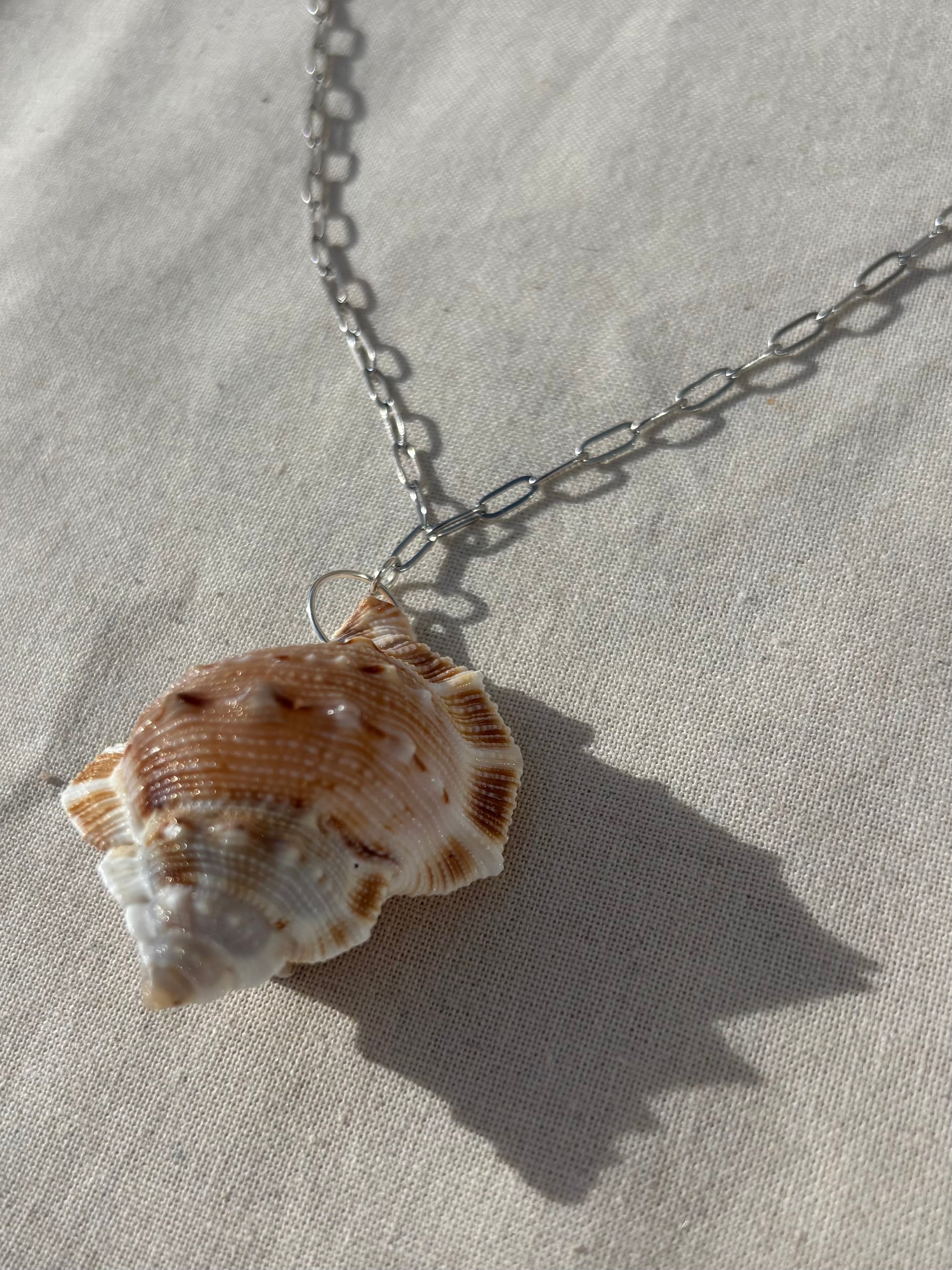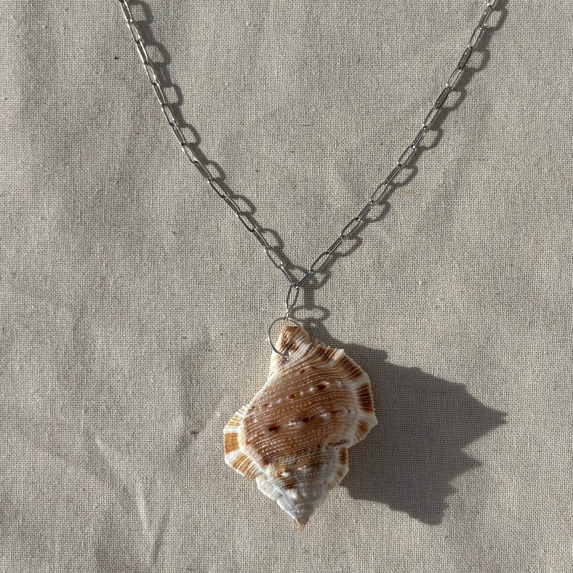 Le collier Zéphyr est une ode au vent salé et aux plages oubliées. Son pendentif est un véritable coquillage, aux reliefs naturels marqués et aux teintes sable et caramel, suspendu à une chaîne argentée à maillons larges en acier inoxydable.