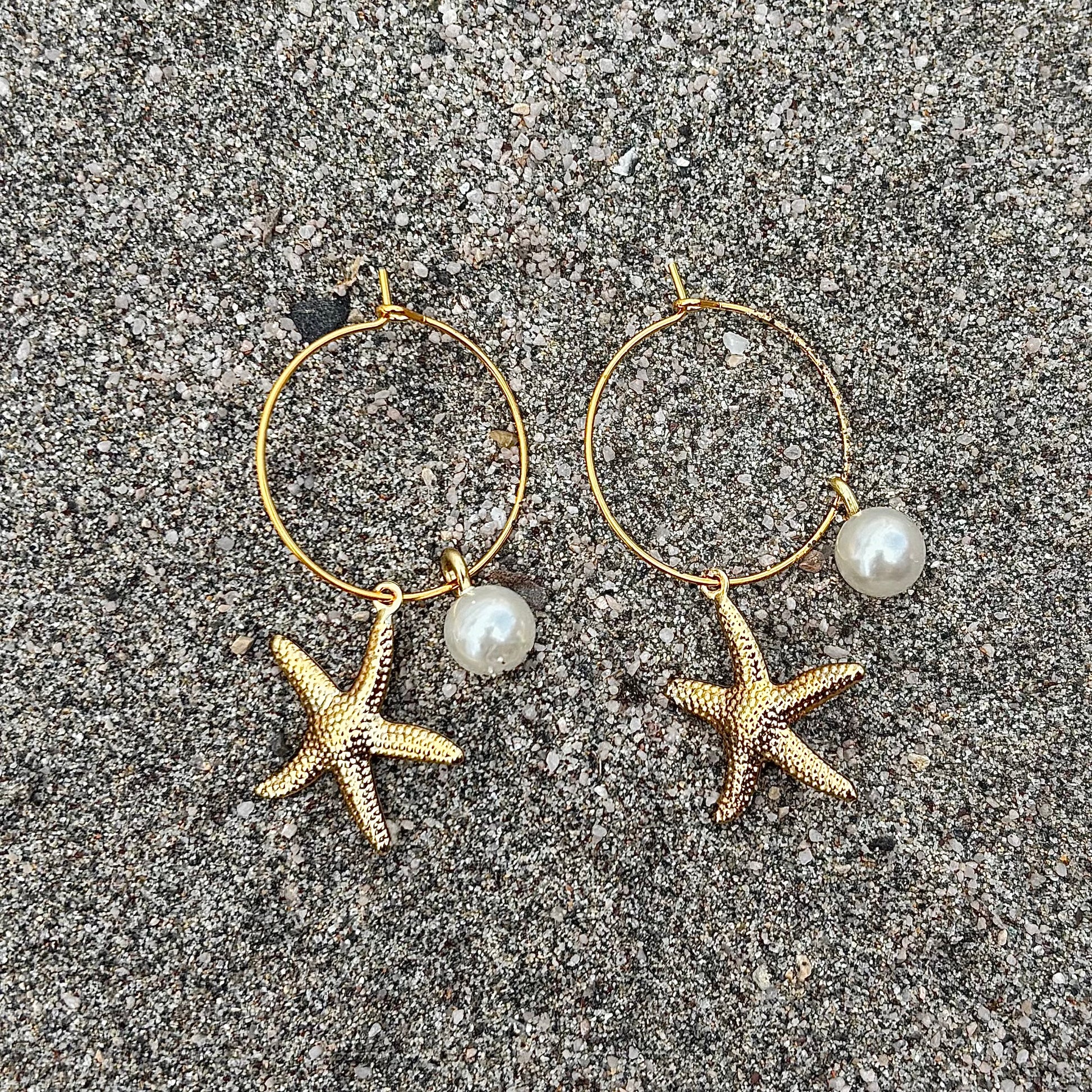 Élégantes et solaires, les boucles Étoiles de Marée capturent l’esprit de l’océan. Chaque créole dorée accueille un pendentif étoile de mer texturé et une perle nacrée, pour un équilibre entre éclat marin et raffinement intemporel.