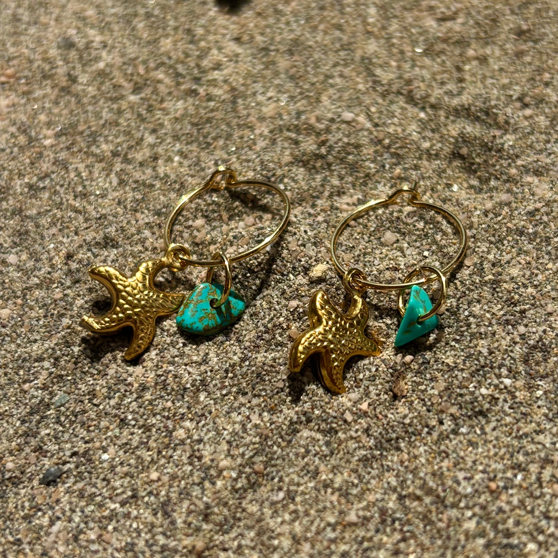 Deux créoles dorées délicatement travaillées, ornées d’une étoile de mer dorée et d’un éclat de turquoise naturelle. Ces boucles symbolisent la mer, la liberté et les souvenirs d’été sur la côte. Chaque pièce est montée à la main dans le sud de la France, avec des pierres uniques.